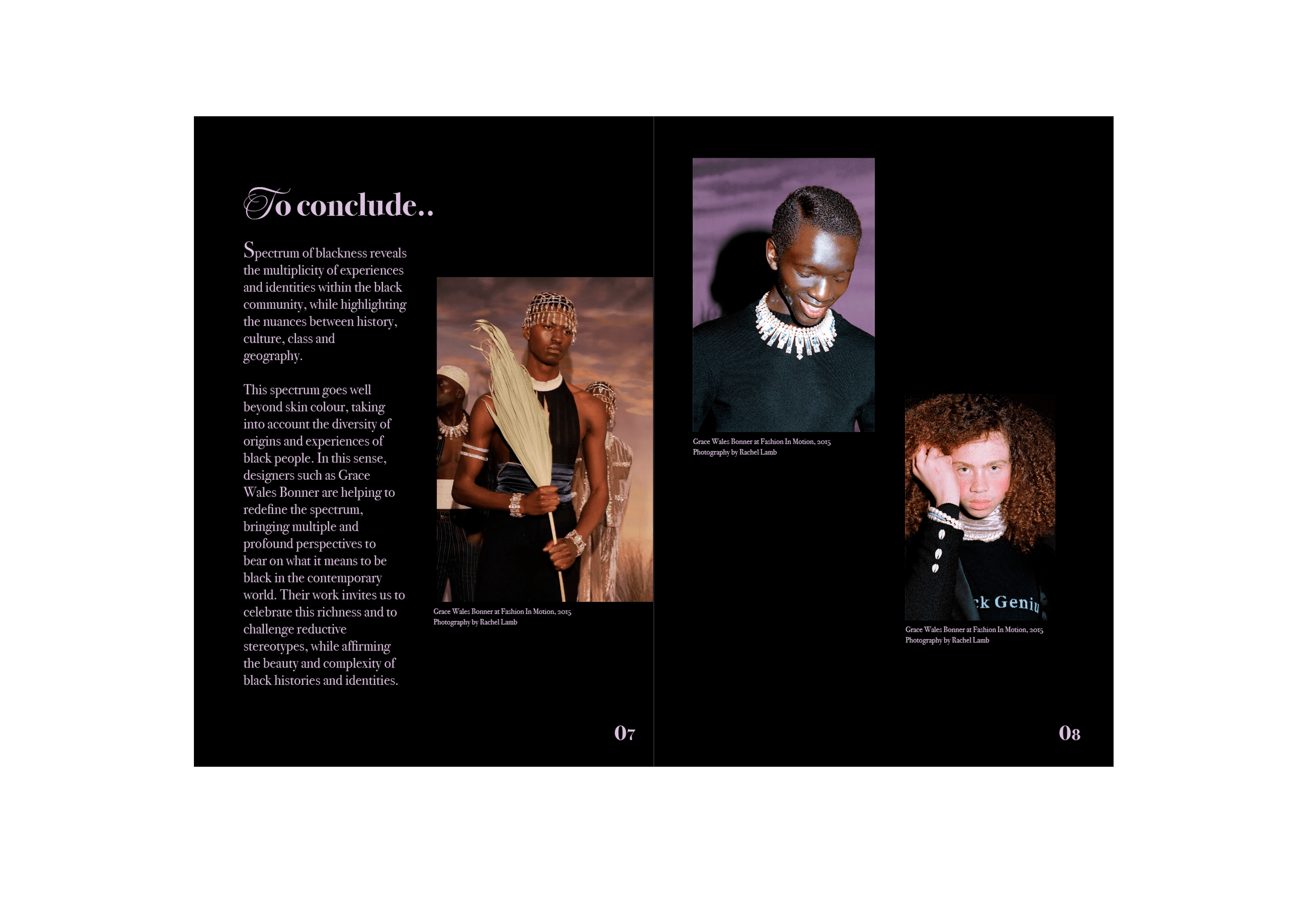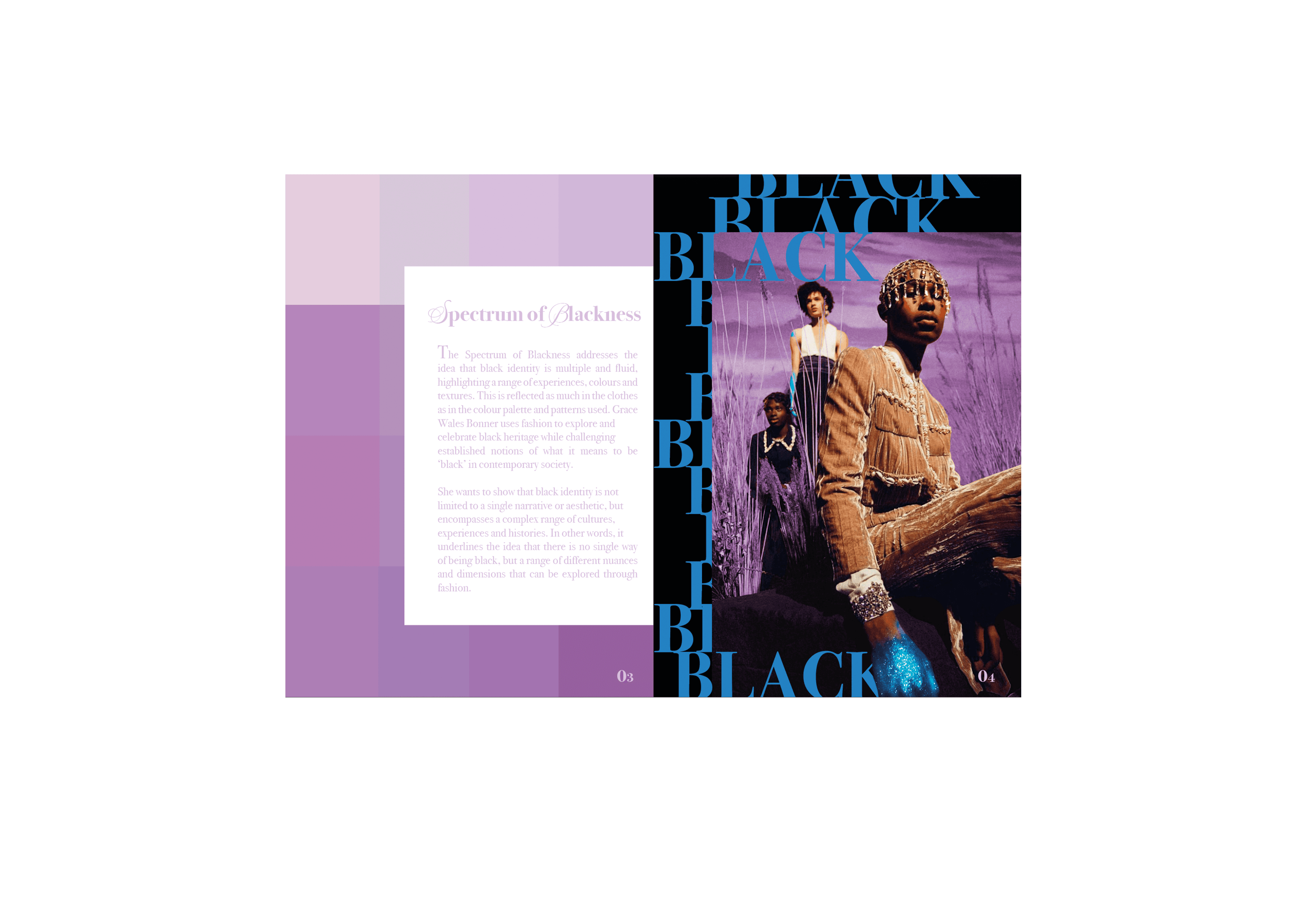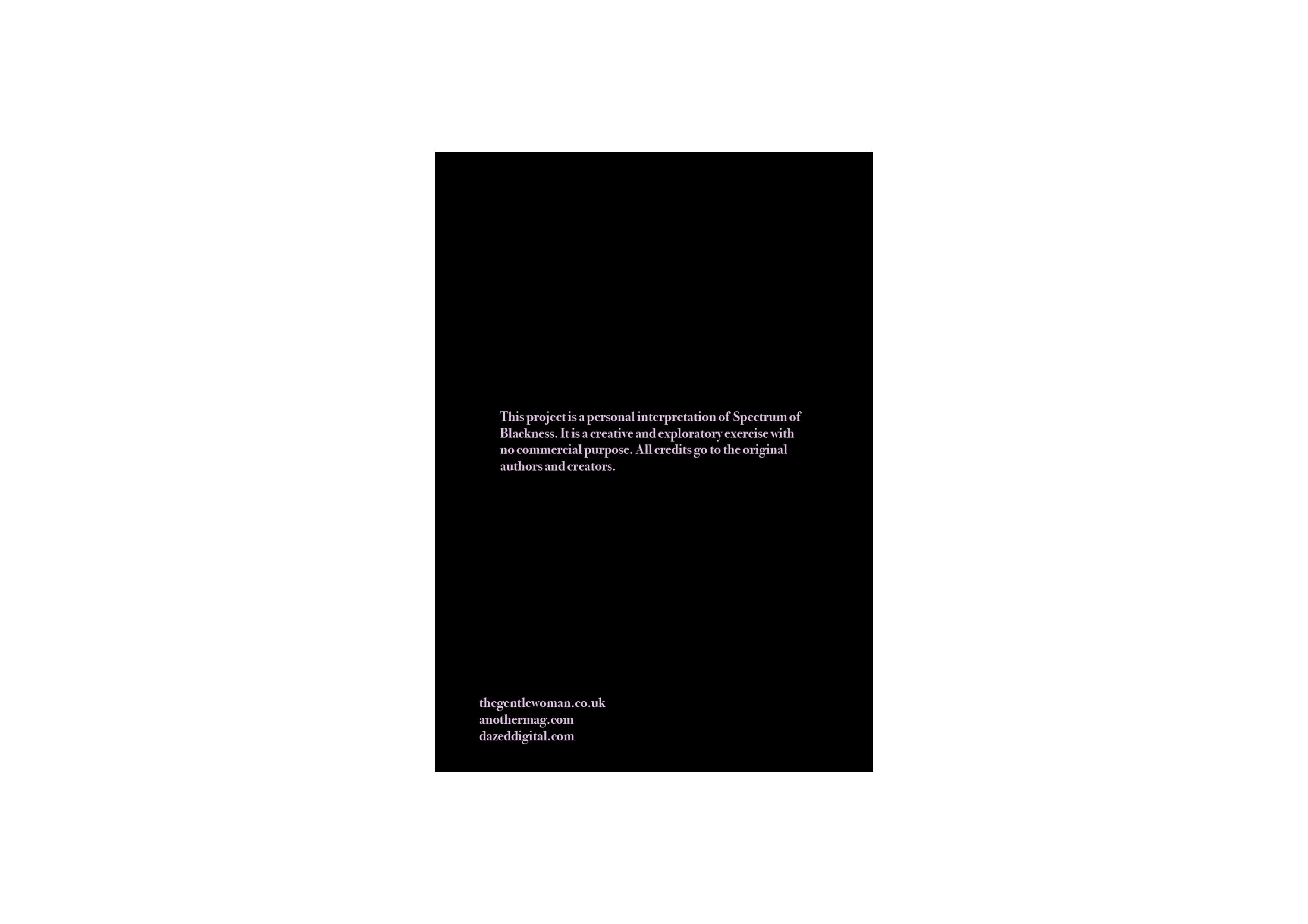 Spectrum of Blackness est une édition qui explore la diversité des identités et expériences noires à travers un prisme graphique et narratif. À travers une mise en page soignée, des choix typographiques et des textures travaillées, ce projet met en lumière la richesse et la complexité du spectres de noirceurs, loin des clichés.